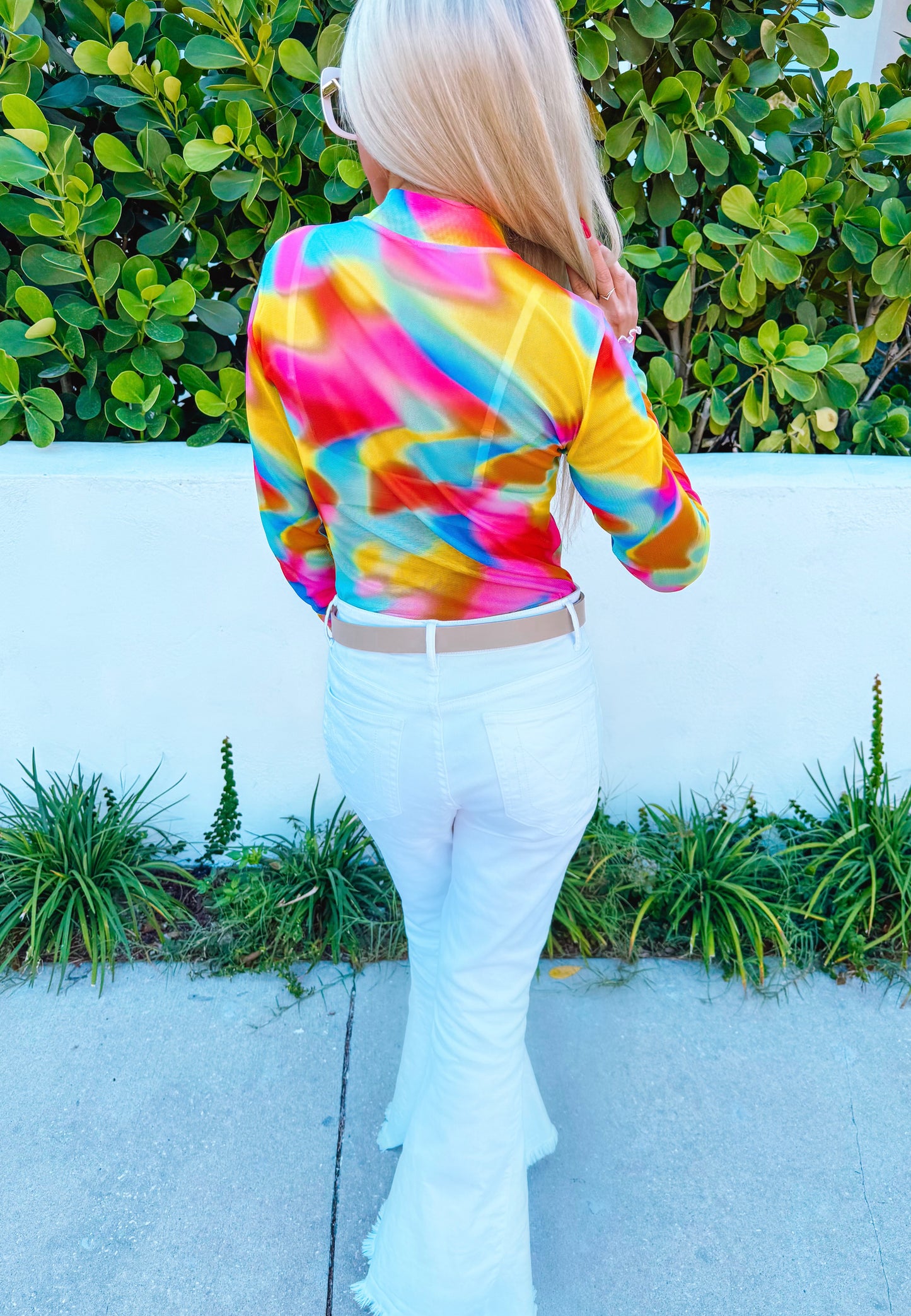 Add a splash of colorful fun with the Technicolor Blur Mesh Top. This long-sleeve piece features a vibrant multi-color design that brings energy and playfulness to any look. Lightweight and breathable, it’s perfect for staying cool while standing out in style.