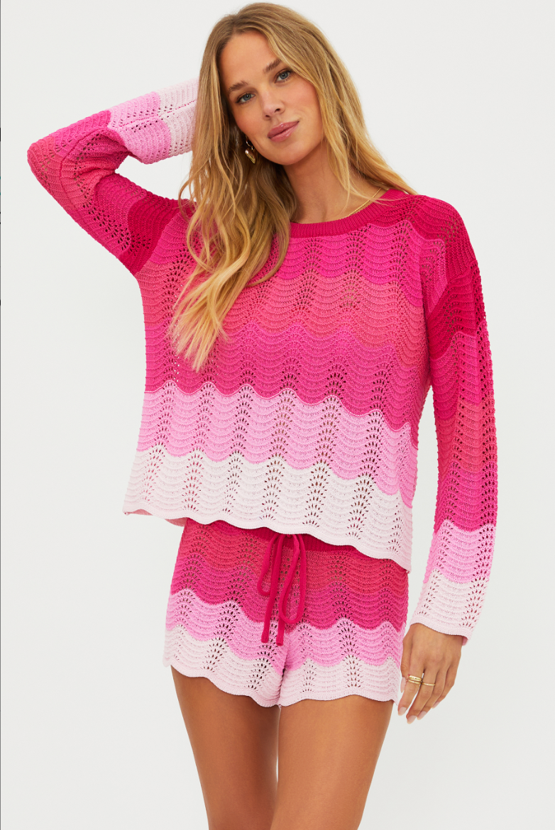 Catch the wave with this breezy open knit sweater featuring a mesmerizing pink ombre pattern that flows from soft blush to electric magenta. The airy fabric keeps you cool while the intricate wave design adds movement and visual interest. Perfect layered over your favorite tank or paired with the Balboa Beach Shorts for an effortless coastal-inspired look. Embrace that beachy, carefree vibe all season long.